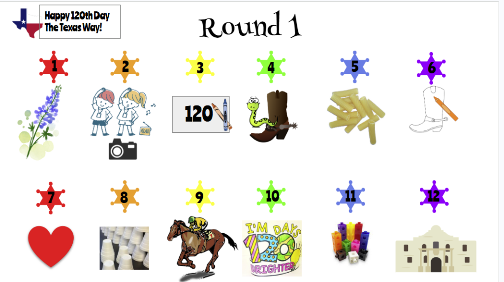 If you LOVE having a 120th Day celebration with your students, you’re in the right place! We dressed up as cowboys/cowgirls and had a Texas-themed celebration. We also asked some parents to help out with our stations. We are fortunate enough to have a big neighborhood around our first-grade classes, so we use that to house all of our stations.