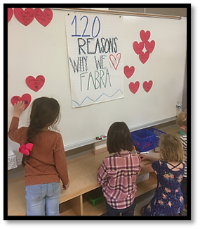 We put up a sign on another bulletin board that says: 120 Reasons Why We Love Fabra. So, the students wrote on a cut out heart why they love our school and then we taped up all the hearts on the bulletin board. It was super cute and just another way to incorporate writing into our stations!